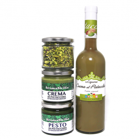 un Pesto e una crema da 190 gr di Pistacchio di Bronte DOP certificato più 100 gr di Granella DOP ed una bottiglia di Liquore al Pistacchio da noi scelta per dare un tocco nuovo a questo trio tradizionale!
